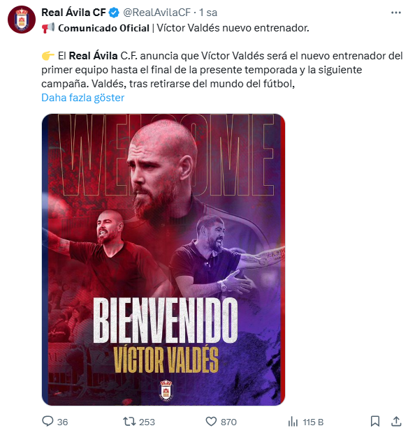 Valdes, İspanya 4. Lig takımı Real Avila’nın yeni teknik yöneticisi oldu. 43 yaşındaki genç teknik adam, İspanyol takımıyla 1.5 yıllık kontrat imzaladı.